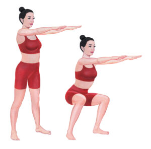 ・太ももが床と平行になるまでしゃがみましょう。